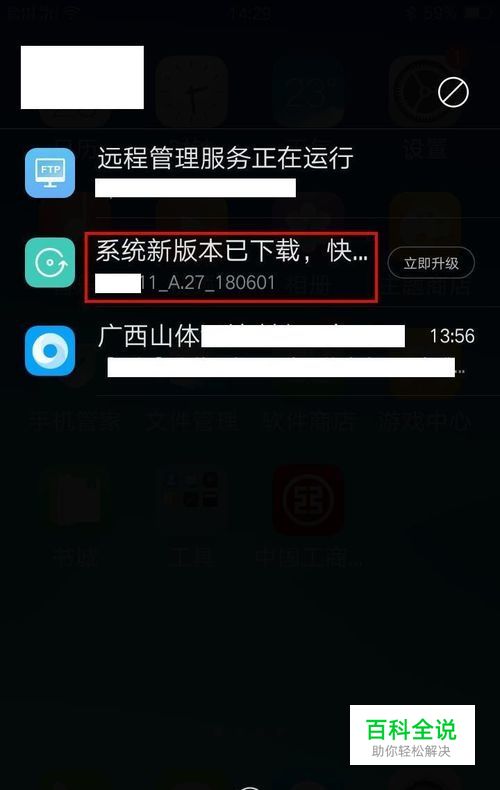 点击打开手机屏幕顶部的下拉功能菜单,当前的信息通知页面显示。欧珀手机系统新版本已经下载。可以点击立即升级,显示有系统升级版本的版本号