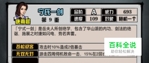 首先,自动1.95版本的 【宁女侠】开放拜师之后,新增了B级玉女十三针(520贡献80正气)和A级宁氏一剑(1500贡献220正气)。 从目前介绍上看属于比较普通的武功,特效也平平,所以玩家们可以考虑好是否需要拜这个师傅。 另外 【劳德诺】处新增了拳法劈石破玉拳,虽威力一般,但聊胜于无。