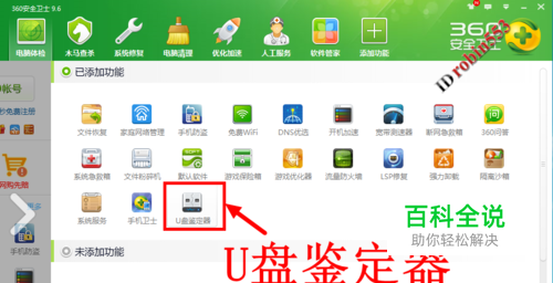 从功能大全中点击“ U盘鉴定器”图标。如果在未添加功能列表里,则需要安装。