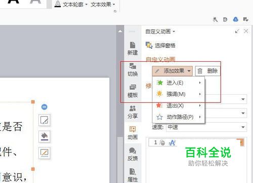 在右上方就会出现“自定义动画”,在下面选择“添加效果”,根据需求选择添加;