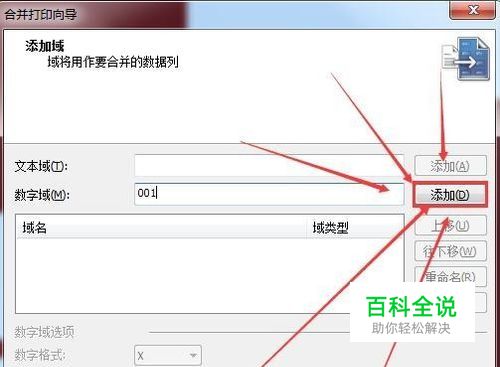 文本域暂时不考虑,看到数字域,数字域改成001或者1或者01等(数字自己决定),数字决定好之后,点击添加(我这里的数字以001为例)