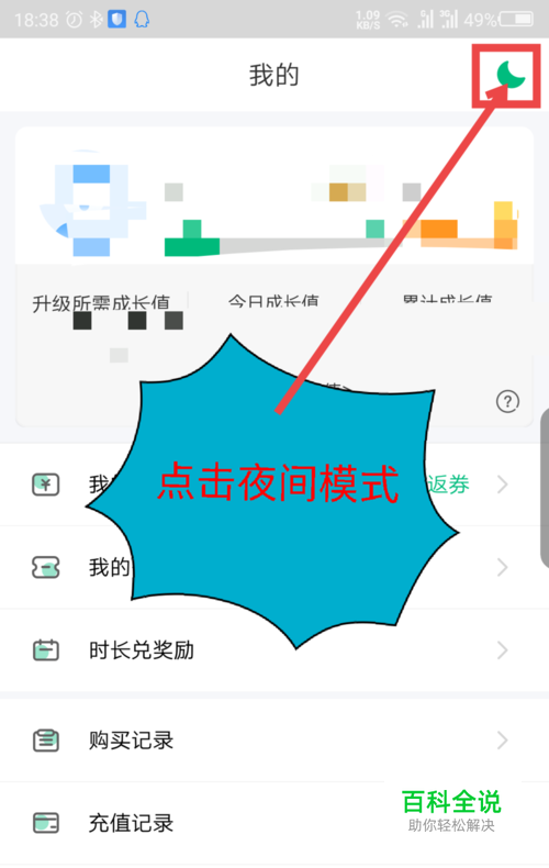 打开我的界面后,在屏幕的右上角有个月亮的标志,点击一下就是夜间模式。操作如截图所示