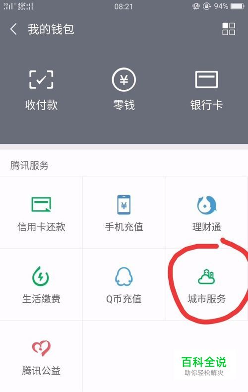 在“我的钱包”页面,点击“城市服务”,如下图所示。