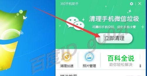 当我们在电脑上安装360手机助手后,手机与电脑通过USB连接线进行连接时,会弹出清理手机微信垃圾的提示,这时点击 立即清理