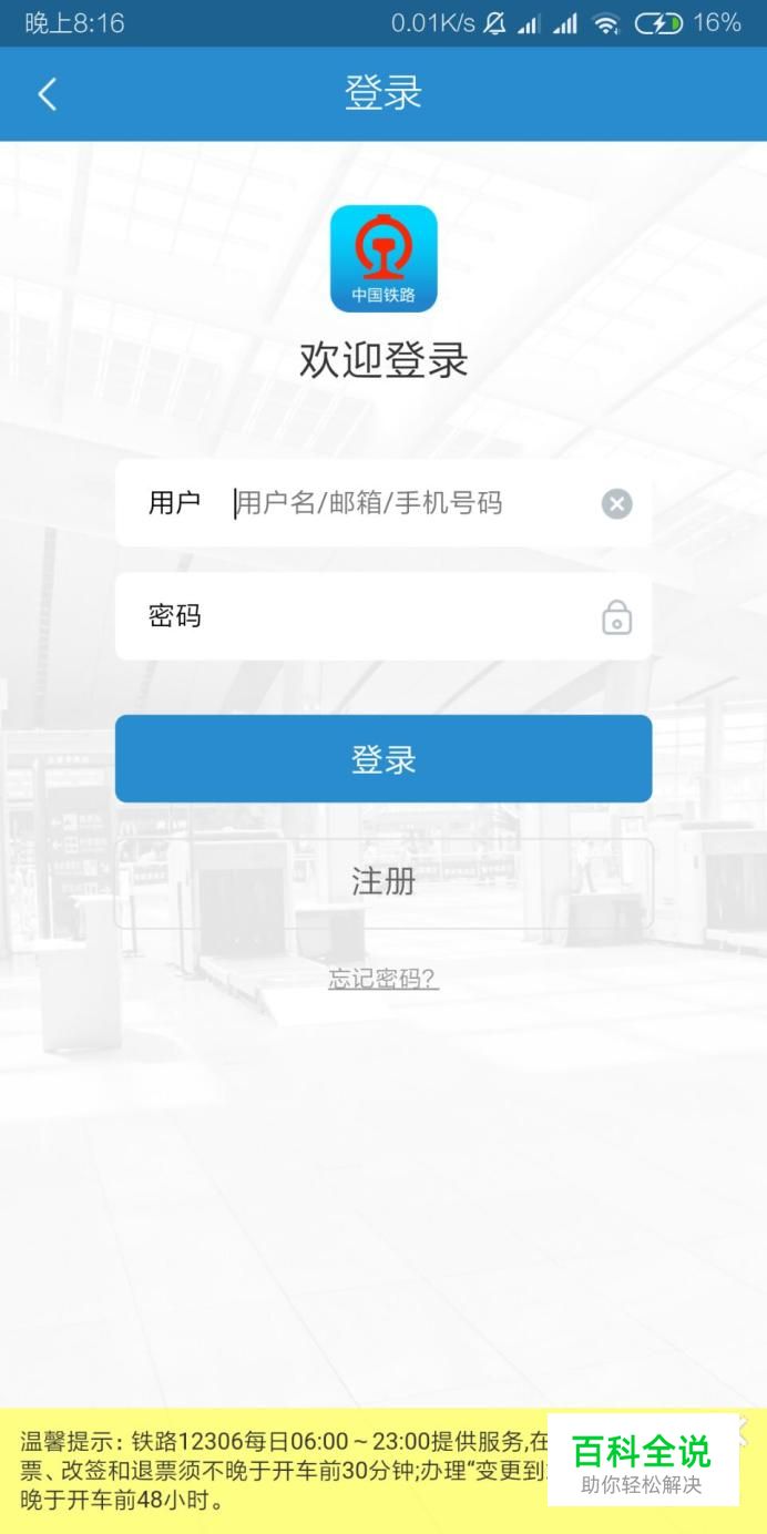打开12306手机APP后,首先登录自己注册好的12306账号。第一次注册需要去火车站核验注册的手机号码。