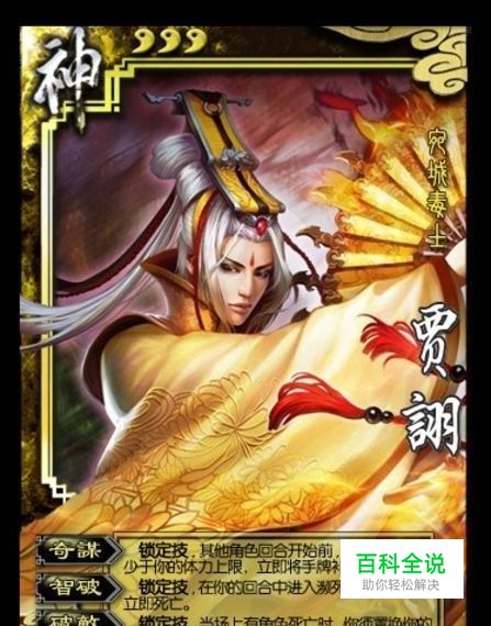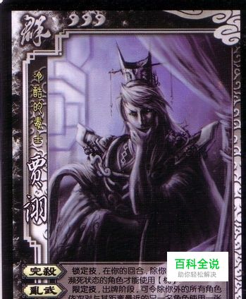 如果说林包的鲁肃是作为一个强力忠臣的典型,那么贾诩绝对配得上是一个强力反贼的典型,完杀这个技能是三国杀所有武将里最为毒辣的技能,他直接穿越了华佗,无视了捏着一大把桃准备救援主公的忠臣,尤其对于孙权来说,主公技在贾诩面前完全失去了意义,再加上贾诩有着一个无比变态的技能-乱武。 帷幕看起来一般,实际是一个非常强大的自保技能。在AOE锦囊中,3张南蛮入侵是黑色,只有一张万剑是红色。顺手,过拆都是黑色多于红色,兵粮寸断和借刀杀人完全免疫,相比之下,陆逊的谦逊就要显得逊色不少,而无懈可击的目标不是贾诩,所以依然可以使用,帷幕是一个非常强大的防御技能,在很多时候,贾诩身上的装备是很难扒下来的,这也导致了贾诩戴着+1马仁王盾防御是多么的可观(一半的牌对他没用)。不过唯一的缺陷是,当贾诩被乐不思蜀的时候,队友可能会握着黑色的顺手牵羊和过河拆桥无奈的看着他(不是我不拆,实在是……) 完杀,这个技能实在是霸道,面对残血的主公,有时候直接被贾诩毙命,就算你有孙尚香有华佗,一样躲不过失败的命运,更何况在除了那个备受争议的张春华之外,贾诩恐怕是最为克制卖血流的角色了,手捏桃子准备救荀彧的刘备,一身装备准备给郭嘉喂奶的孙尚香,见到贾诩都是无可奈何,不过贾诩的完杀毕竟是锁定技,锁定技造成的后果就是,比如红色的闪电劈中自己,比如自己放A不小心打死了队友……这也是锁定技的无奈。因为有着完杀的技能存在,所以玩贾诩的时候最好确保手里留杀,不然轮到你逆天的时候你发现满手桃闪的时候你只能仰天长啸了。比较克制贾诩的武将有大乔,小乔(姐妹花),小乔的黑桃锦囊都视为红桃。大乔的乐不思蜀都是红色。被贾诩抚摸狗头笑而不语的角色是徐晃,甘宁。 被克制一半的角色是双雄,袁绍(黑色决斗,黑色万箭) 乱武,限定技,和庞统的涅盘一样,一局游戏只能用一次。正因为如此,贾诩选择发动乱武的时机就尤为重要,比如在你想杀的人周围有两个自己的队友,比如你确定想杀死的人手里没有留杀,之类的,更为变态的是,不出杀选择掉血是扣减体力而不是受到伤害,这也意味着郭嘉,司马,荀彧等在碰到乱武的时候无法发动技能,并且乱武时依然带有完杀效果,所以看准时机很重要,千万别为了爽一把(再不放乱武老子就死了!)而把队友给活活害死了。(神仙难救- -)