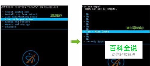 3、在选择- wipe cache partition 清除缓存 4、最后选择- Yes - Wipe Cache 确定清除缓存