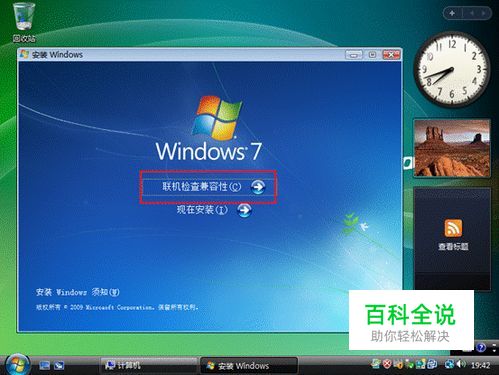 开机进入Vista系统,并插入Windows 7安装光盘并运行,会弹出Windows 7的程序界面,其中由两个选项,即:“联机检查兼容性”和“现在安装”。联机检查兼容性:该功能可以通过联机下载下来的程序,测试本机是否可以升级Windows 7系统,且会对硬件性能进行一定得评测。使用方法如下: