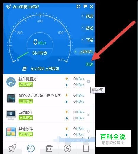 有个绿色的测速两个字,点击“测速”这两个字之后,毒霸加速球就开始测网速了。大约半分钟的时间,就可以看到我们的宽带到底是几兆的,如带宽是6MB/S的。