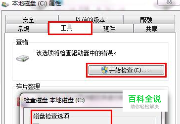 建议首先执行磁盘扫描程序对系统盘进行检测,看看磁盘驱动器是否存在磁盘错误或文件错误; 首先鼠标右击系统盘选择属性,然后在打开的属性界面中,选择工具标签,点击查错里的“开始检查”按钮,然后勾上下图红框内的两个选项,并点击开始。