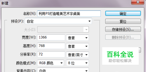 2.新建一个与你电脑一样大小的文件(我这里是1366*768)如图.
