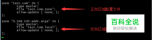 配置bind区域声明文件/etc/named.rfc1912.zones 添加test.com的正向区域声明配置和反向区域声明配置