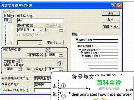 Step3 在“多级符号”选项卡中,点选第一行最右侧的样板,再单击“自定义”,打开自定义多级符号列表。 1.在左侧选中级别1,再将它的“编号样式”改成自己想要的项目符号(这里我设置的是圆点符号)。 2.单击“高级”展开对话框,“将级别链接到样式”设置为“列表项目符号”;“编号之后”设置为“制表符”。 3.符号与文字位置的设置。