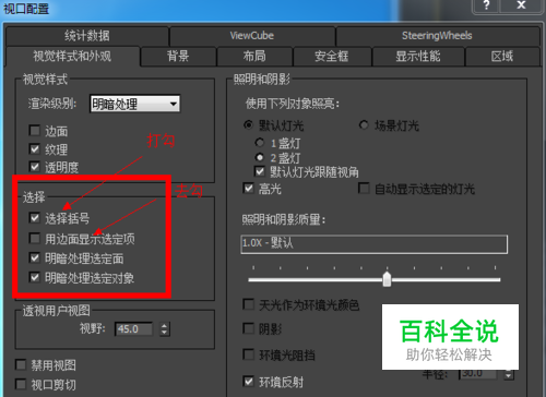 点击,视图>视口配置>视觉样式和外观>选择项里>口:"选择括号"打上勾,口:"用边面显示选定项"去掉勾。字数补丁………………