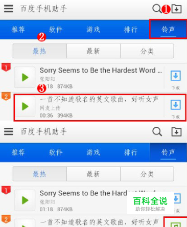 一般来说,很多人都用手机系统自带的功能进行来电、短信、闹钟铃声的设置,这样设置不但麻烦,而且还管理起来也特别不方便,经验摸索,发现用百度手机助手管理手机上的铃声特别方便,不管是下载、设置,还是删除与卸载,都特别的快,下面把简单的操作方法与大家分享一下: 一、下载一个百度手机助手并安装(百度一下即可),在打开首页的最右边找到“铃声” 二、在“铃声”界面中可以看到“最热”、“最新”、“分类”三种类型的铃声,选择“最热”的铃声,以此为例来说明; 三、在“最热”铃声中,选择一个喜欢的铃声,点“下载”,瞬间就下载完了,很快的,省去了搜索的过程,非常方便 四、然后点下“设置”,在弹出的界面中,选择“来电铃声、短信铃声、闹钟铃声”其中一个即可; 五、当然,如果不想要刚刚才设置的铃声,可以更换或者直接删除、卸载即可; 更换铃声的话,按照第四步的操作就可以快速的切换; 卸载铃声的话,可以依次点“设置”—>“铃声管理”,然后,点下你要删除的铃声,接着点“删除”,就可以删除该铃声了; 除此之外,还有一些其它的功能也是比较实用的,像用百度手机助手可以播放手机上的音乐,也特别好用,有兴趣的朋友们可以自己尝试一下哦~~~~~~~~~~~~