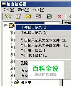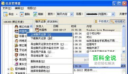 第2步,在左边的好友列表窗格中右键单击准备上传聊天记录的好友昵称,在弹出的快捷菜单中选择“上传聊天记录”命令,如图2010040852所示。 图2010040852 单击“上传聊天记录”命令