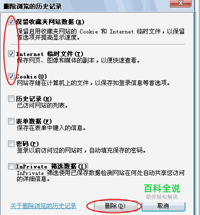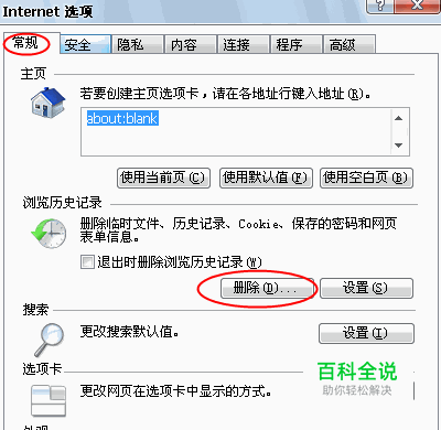 2、删除Cookie及临时文件:温馨提示:删除Cookie会影响到您保存的某些网站自动记忆功能。如:原始记录某些网站的自动登录将无法实现,但您只需手动输入用户名密码登录一次即可恢复;原始您放在某些购物网站购物车中、未购买付费的商品将清除,需要重新添加到购物车。 a、选择“常规”标签页,点击“删除”按钮: 点击“删除”按钮b、删除Internet临时文件以及cookie: