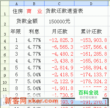 8.选中E列,右击鼠标,在随后出现的快捷菜单中,选“隐藏”选项,将该列隐藏起来。 至此,“住房贷款还款金额速查表”制作完成。我们来试查一下(假定商业贷款15万元,期限为10年): 选中C2单元格,此时该单元格右下角出现的下拉按钮(如图3)。单击此按钮,在随后出现的下拉列表中,选中150,000选项;在B2单元格,选中“商业”选项,计算的结果就出来了:查10年期限所在的行,知道每月应还款1593.9元,累计还款191270.1元(图1)。 几点说明:①由于是住户偿还银行的贷款,所以计算出来的结果,系统以红色显示出来。②如果国家调整贷款利率,大家只要修改一下B4至B列最后单元格中的公式即可。