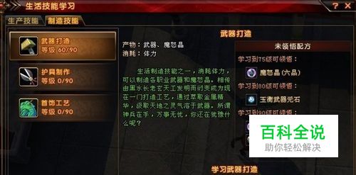 制造技能分为武器打造、护具制作、首饰工艺。 武器打造是用来制作武器、魔怒晶等。需要消耗体力和材料。 护具制作是用来制作盔甲、裤子、靴子、手套、护肩、头盔、腰带。需要消耗体力和材料。 首饰工艺是用来制作披风、戒指、护符、项链。需要消耗体力和材料。