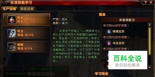 生产技能分为炼金、符文、驯兽。 炼金可以生产出生命药剂、魔法药剂、复苏药剂、体血药剂、精魔药剂、武器打造材料和苍郁魂珠。制造时需要消耗活力和魔血。魔血可以通过血盟NPC边魏处购买或者打怪获得。