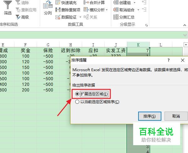 在弹出的排序提醒对话框,我们选择“扩展选定区域”即可,此时工资表就被分割成以下的状态了...