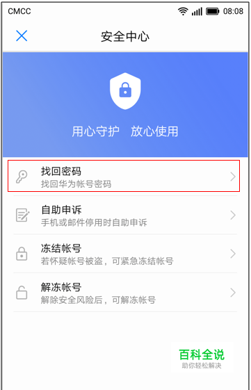 第2种方式:在桌面点击“设置”->进入华为帐号“帐号中心”(已登录)->“安全中心”->“找回密码”;