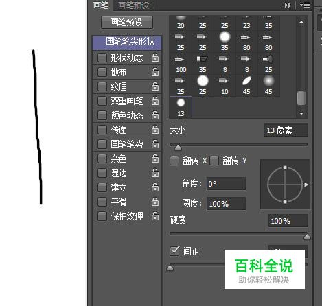 先设置画笔适当大小,我的是13像素,其他设置如图(相当于实线是设置)