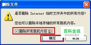 然后在打开的“删除文件”窗口中,勾选“删除所有脱机文件”并点击“删除”按钮即可完成浏览器缓存的清理。