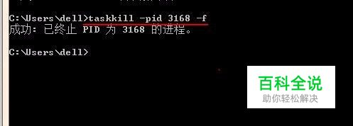 再次输入指令:taskkill -pid 进程pid -f 这里已图片为例指令为:taskkill -pid 3168 -f,回车即可
