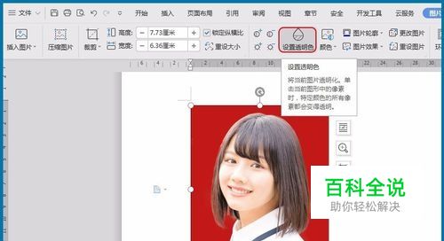 【设置透明色】 单击证件照在菜单栏出现 “图片工具”,点击 “设置透明色”后将鼠标移动到证件照的背景色位置,单击它即可将原证件照背景透明化,之后填充自己想要的颜色,操作如下一步。
