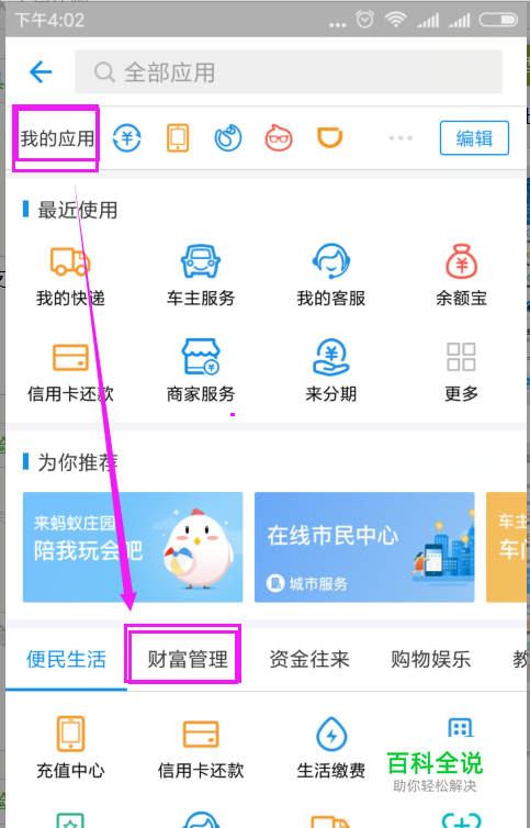 首先打开支付宝,然后点击更多,进入到支付宝“我的应用”界面,点击“财富管理”,如图所示