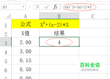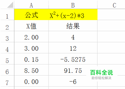 见下图黄颜色填充的公式,就是我们需要计算的,A列为X的值。 在B3单元格输入公式=A3^2+(A3-2)*3