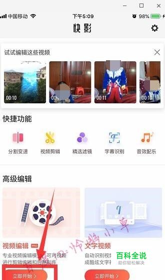 打开快影,点击“视频编辑”下面的“立即开始”。