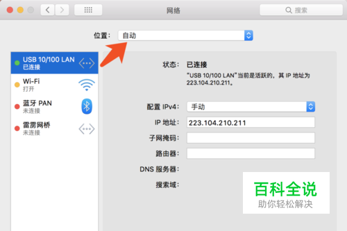 在“网络”设置窗口最上方的“位置”一栏,点击“自动”,选中下方的“编辑位置”。