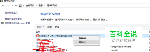 在卸载或更改程序界面找到Office 2016,右键之,点击《更改》菜单(如图),进入到更改Microsoft Office 2016的安装界面。