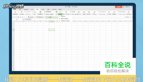 找到工作栏中的“数据”,点击“有效性”,点击“有效性”后的下拉三角,选择“有效性”。
