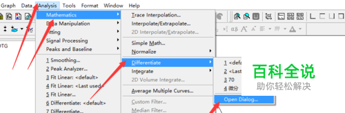 对该图形进行一阶求导:点击“analysis”—“mathematics”—“differentiate—“open dialog...”如图所示,打开对话框。