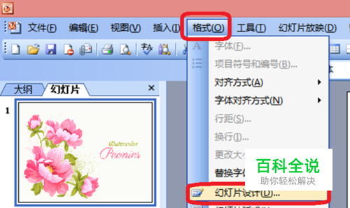 打开ppt,首先找到应用设计模板。找到应用设计模板的方法有两个。一个是点击上方工具栏中的格式,在下拉框里点击“幻灯片设计”,然后在ppt页面的右侧就会出现应用设计模板了。