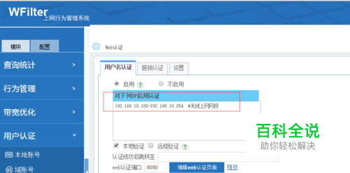 2. 无线上网的设备要不要绑定? 手机等无线设备,默认都是自动获取IP的,而且手机都是私人物品,网管不能直接进行操作。这里就分为两种需求。 2.1) 不限制无线设备的接入。 简单点来说:给无线设备单独设置一个VLAN,全部自动获取IP,在网关上对无线网段进行限速就可以。这种情况不需要进行绑定,对所有的无线设备网段配置同样的上网行为策略和流控策略。优点是配置和部署方便,缺点是只能实现一刀切的管理,无法对无线设备的准入进行控制,也无法对设备单独设置上网策略,无线上网的速度和稳定性得不到保障。 2.2) 无线设备严格认证。 有些局域网的要求比较严格,只有允许的设备才可以接入。这种情况下,就需要对无线设备进行IP-MAC绑定,并且要在DHCP上配置静态地址分配(如WFilter NGF的IP-MAC绑定功能),那么即使手机设置的是自动获取IP,每次也都会获取到同一个IP地址,并不需要修改手机的配置。这种方案是优点是接入严格控制、上网策略和记录统计可以对应到个人;缺点就是需要登记管理每台手机的mac地址和ip地址,管理麻烦些。 2.3) 对无线设备进行Web认证。 不进行IP-mac绑定,但是启用”Web认证“,基于账号来进行管理和统计。也是一个有效的管理方式。如图: