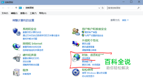 第三步:找到 时钟、语言和区域后,点击进去,然后继续找到 语言选项,如图所示的界面。