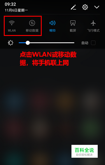调出通知栏以后,点击WLAN或移动数据,将手机联上网。
