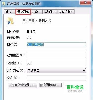 在弹出的“属性”对话框中单击切换到“快捷方式”选项卡。