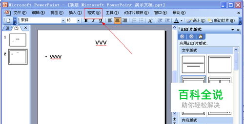首先我们打开PPT2003文档,然后选择PPT文档菜单栏上的格式选项,如图所示: