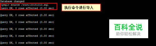 执行命令source /root/20151010.sql。执行数据库导入命令。 待导入完毕,执行下一步操作。