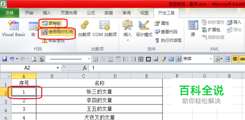 怎样新建宏? 在录制宏之前,首先要有宏。新建宏的步骤有以下几项。 1、选中一个起始单元格,如A2。 2、点击“开发工具”→“使用相对引用”→“录制宏”。 3、输入宏名,快捷键,点击“确认”。