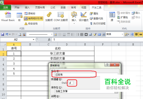 怎样录制宏? 完成新建宏后,开始录制宏。 大家按照自身需求,操作Excel完成具体操作即可。 下图是小编的两组宏操作。 1、对已发布的文章进行字体加粗变色并在最后输入已发布字样。完成设置后,点击“停止录制”。 2、对未发布的文章进行另一种字体加粗变色并在最后输入未发布字样。完成设置后,点击“停止录制”。