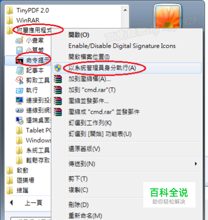 然后右击“附属应用程式”下的“命令提示符”,选择“以系统管理员身分执行”: