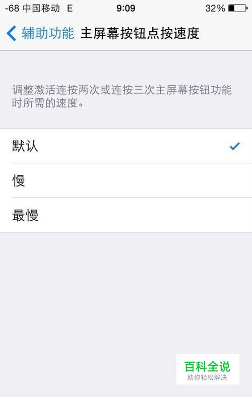 设置--->通用--->辅助功能--->主屏幕按钮点按速度—>将速度设置为默认。 你看是不是设置慢了?