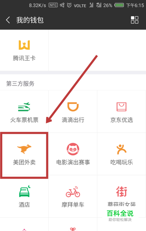 首先我们打开美团外卖,我一般是通过微信来订美团外卖的,因此这里我以微信里的美团为例,点击【美团外卖】,如图所示。
