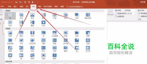 打开PPT后在菜单栏目找到【切换】,然后系统自定义的有这么多都是可以设定的;